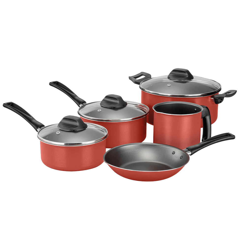 As panelas possuem base em alumínio, que distribui o calor de forma uniforme, garantindo o cozimento rápido e homogêneo dos alimentos.
