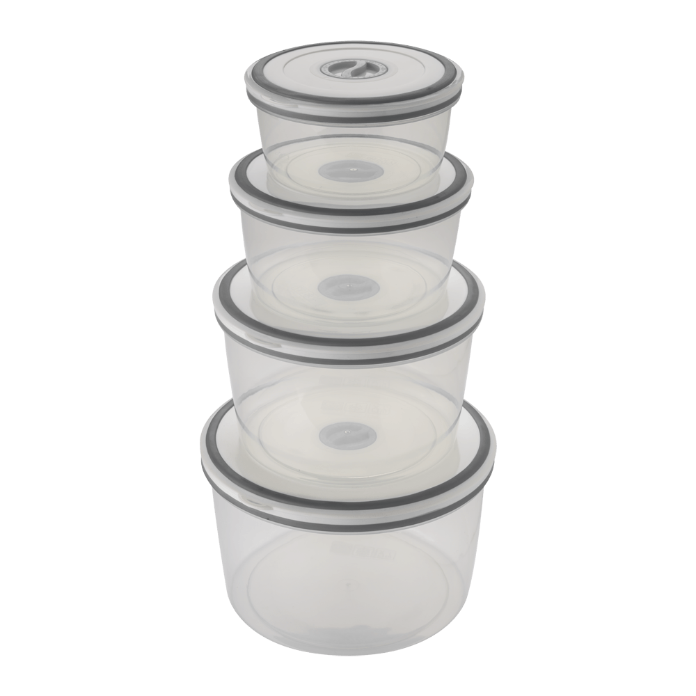 4 potes redondos de diferentes tamanhos, todos com tampas herméticas.